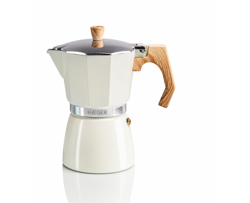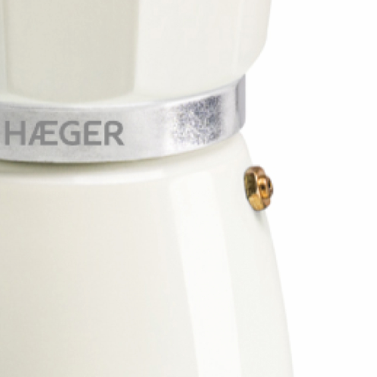 Cafeteira HAEGER MOKA POT 6 com corpo em alumínio, base com válvula de segurança, adequado para uso em todos elementos, exceto indução.