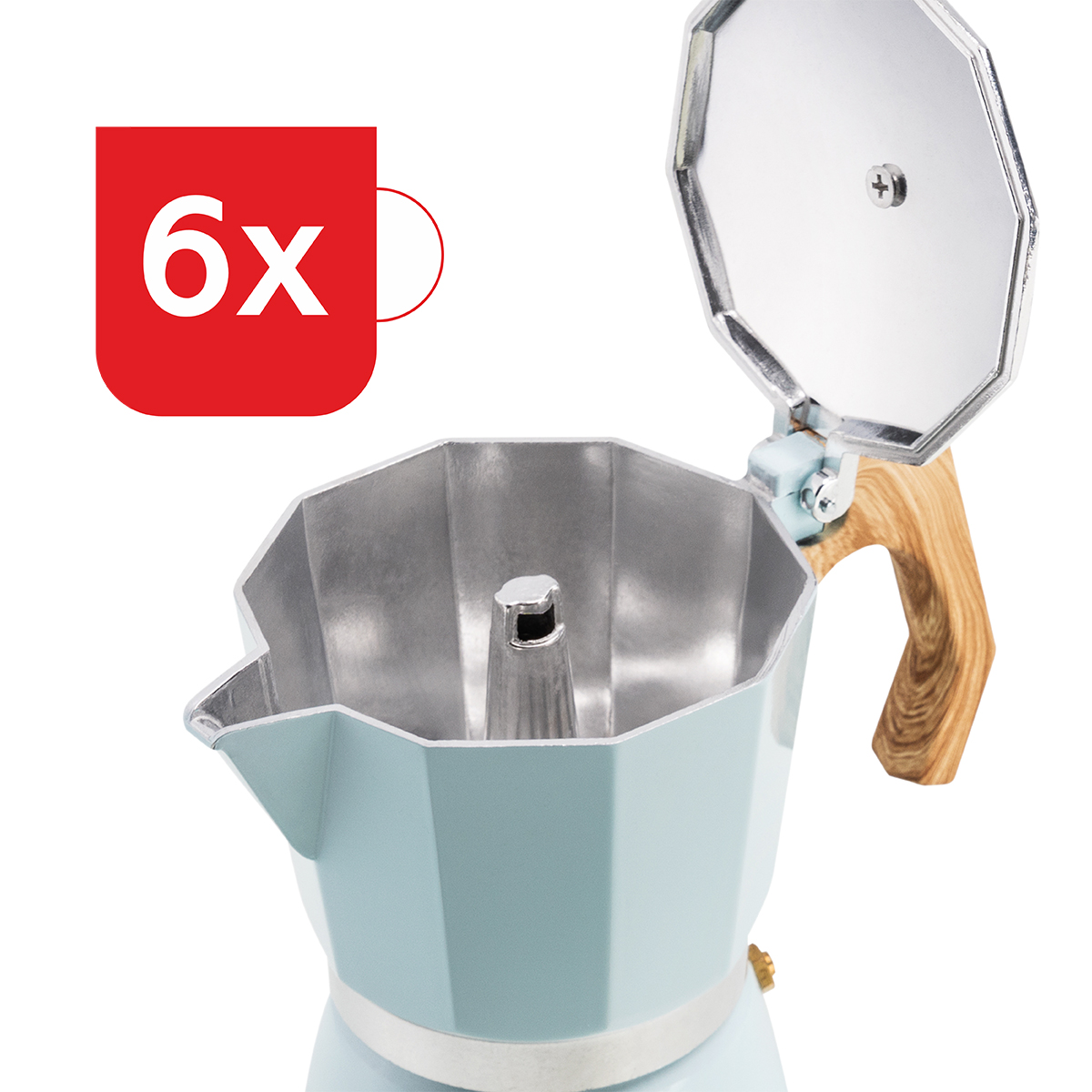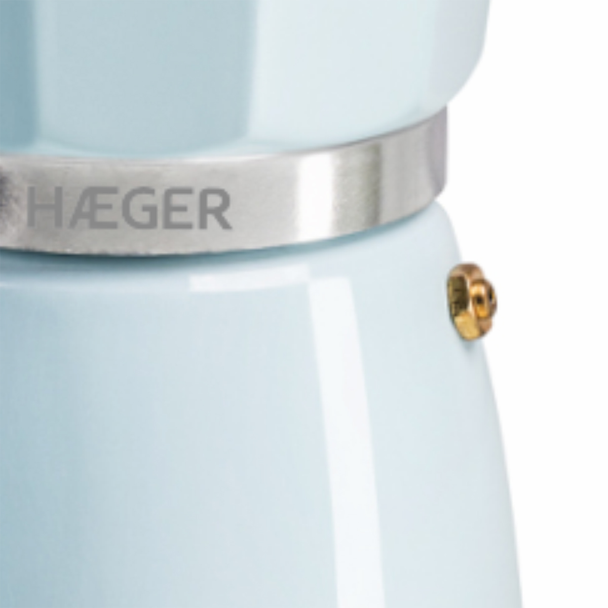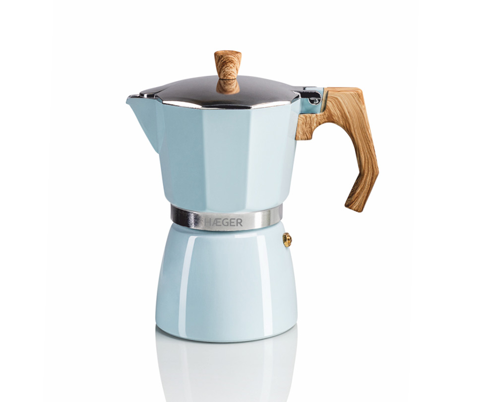 Cafeteira HAEGER MOKA POT 6 em azul e com o corpo em alumínio, base com válvula de segurança, adequado para uso em todos elementos, exceto indução.