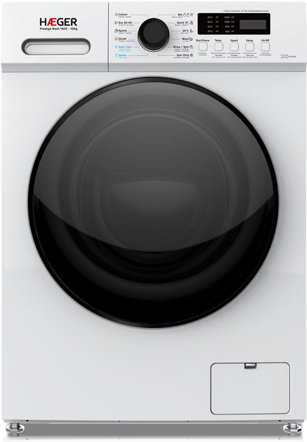 A máquina de lavar roupa HAEGER Prestige Wash 1400 tem capacidade para 10 kg e combina eficiência energética Classe A, motor BLDC Inverter silencioso e 12 programas inteligentes, incluindo ciclo a vapor, garantindo roupas impecáveis com menor consumo de energia e água.